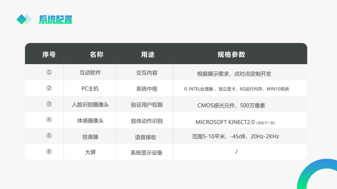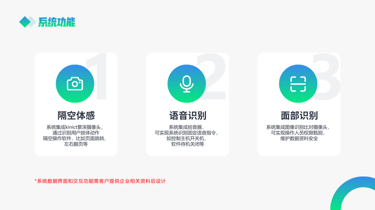 运用数字多媒体展示手段,结合先进的软硬件交互技术,实现对内容展示的隔空操控、语音指令识别、面部识别验证等功能,告别传统内容的交互展示方式,使内容展示体验更加方便快捷,展现科技智慧的企业形象。