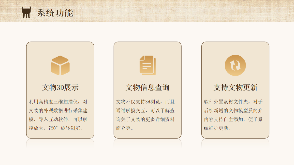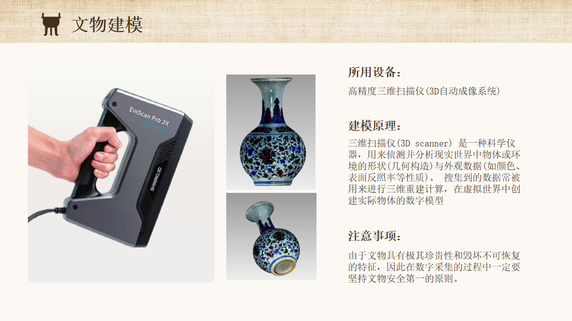 数字文物就是利用最新的3D自动成像系统对文物进行数字化二次还原,三维模型不仅可以用来保存文物的数据,还可以用于虚拟展示,参观者通过触控交互,即可浏览文物的三维全貌和信息,能让更多的人了解文物背后的故事,解决了旅游推广与文物保护之间的矛盾。