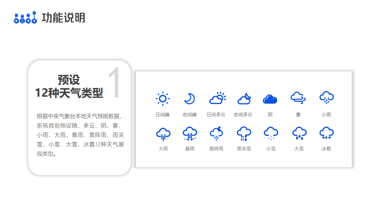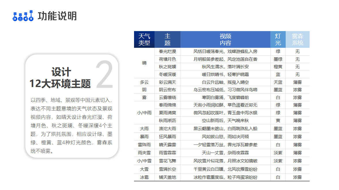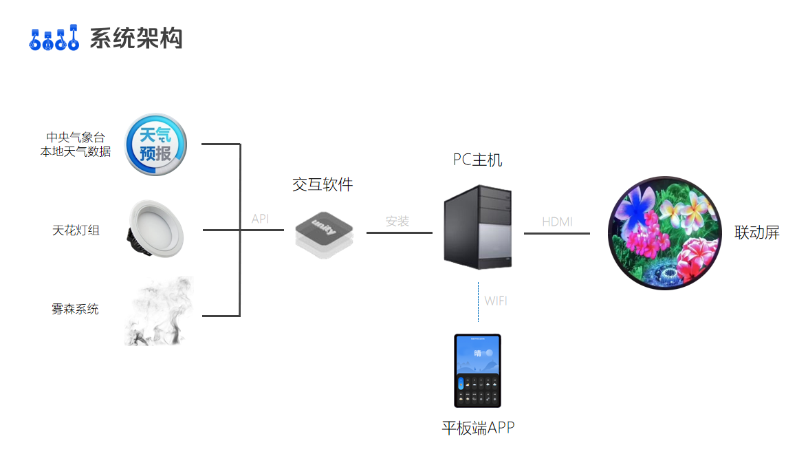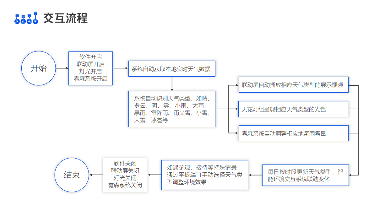 智能环境交互系统是根据中央气象台本地天气预报数据信息,联动相应主题的视频自动播放,同时天花灯组调光调色、雾森系统调节雾量,烘托相应主题的天气氛围,营造智能化的无感环境变化,让游客沉浸在实景环境氛围中。
