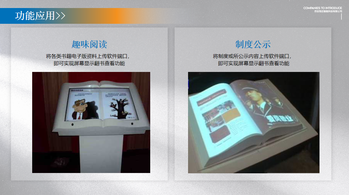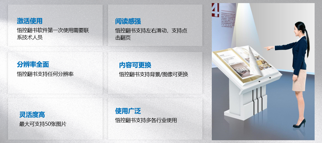 虚拟翻书互动,通过感应人体手势动作,参观者在展台上做出翻书的动作时,虚拟图书会感应到自动翻页,无论是向左向右,都能自动翻页,带来不一样的翻阅体验。